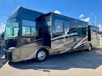 2008 fleetwood revolution LE 41ft diesel pusher with 3 slide outs has one full wall slideout has 400HP cummins engine with 6 speed Allison transmission with only 98k miles 8k watt onan generator has inverter air ride suspension leveling jacks large electric awning good tires DOT(2022) tow package backup and side view cameras large basement storages 2 ducted A/C units and heat large refrigerator and freezer microwave stove oven large bathroom with glass shower walk around queen bedroom lots of c
