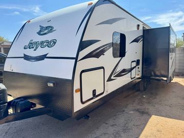 2016 jayco white hawk 27DSRL 31ft travel trailer with large slide out has good tires electric hitch large electric awning ducted A/C and heat refrigerator and freezer microwave stove oven large bathroom with glass shower walk around queen bedroom sleeps 6 lots of cabinet and closet space non smoker no pets in excellent condition in and out clean title this is being sold as a private party sale so no sales taxes or fees!